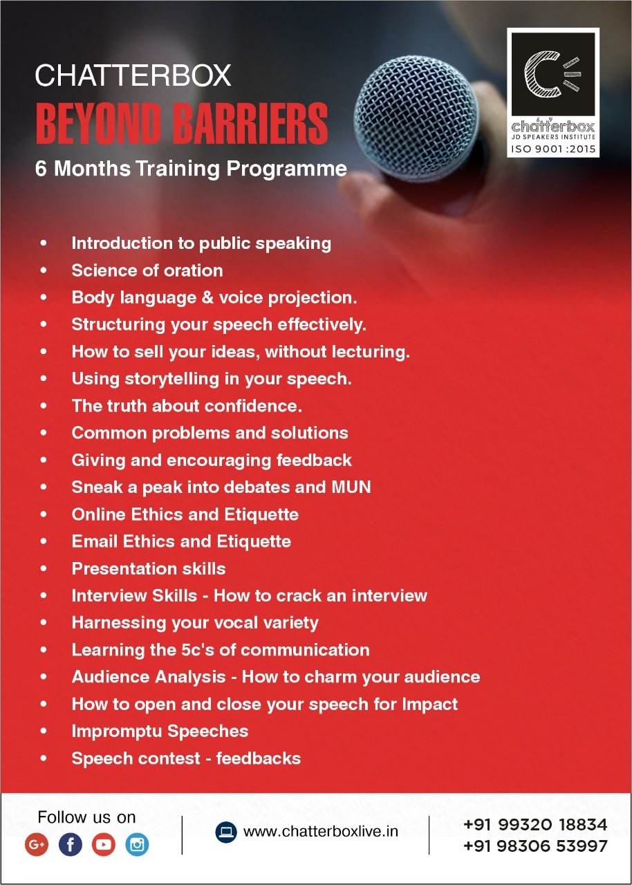 Beyond Barriers admin_website2022-06-17T07:10:56+00:00 A complete learning course on Communication Skills from Chatterbox Call us on 9932018834 / 9830653997 Enroll Now icn FacebookTwitterLinkedInGoogle +Email Uncategorized Read more...